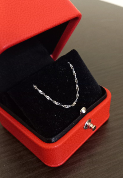 Тонкий,но мега блестящий.Надежный замок.Красивое плетение,дополнительных украшений на него не нужно.