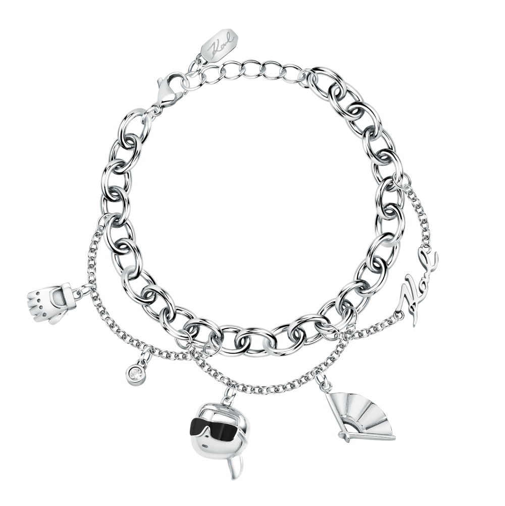 Браслет из коллекции бижутерии KARL LAGERFELD Charms. Яркий дизайн изделия: вставка из бесцветных кристаллов из стекла на стальном корпусе цвета серебра, переосмысливает визульные коды бренда, следуя неповторимому дерзкому стилю кутюрье. Тип застёжки: карабин. Размер изделия 16+3 см. Гарантия 14 дней.