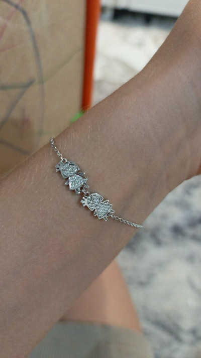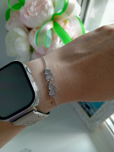Давно хотела такой браслет, всё ждала когда рожу второго ребёнка. Браслетик тоненький,смотрится очень аккуратненько на руке. На браслете 2 девочки в россыпь из фианитов,на солнышке камушки переливаются. Сзади можно сделать гравировку с именем ребёнка и датой рождения, что я и собираюсь сделать в дальнейшем.