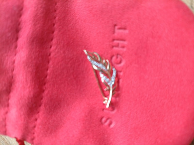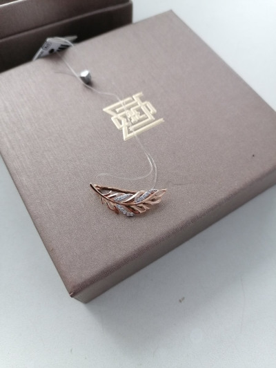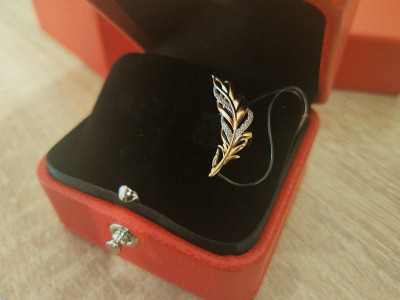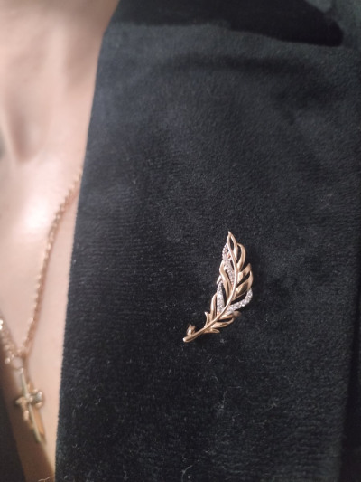 Брошь не очень большая, но фианиты и золото играют великолепно. Форма броши сделана выигрышно, можно носить углом листочка хоть вверх, хоть вниз или бочком. Застежка простая, но надежная. Брошь идеально подошла к блузке, преобразила ее, показала себя во всей красоте и великолепии. Брошью довольна.
