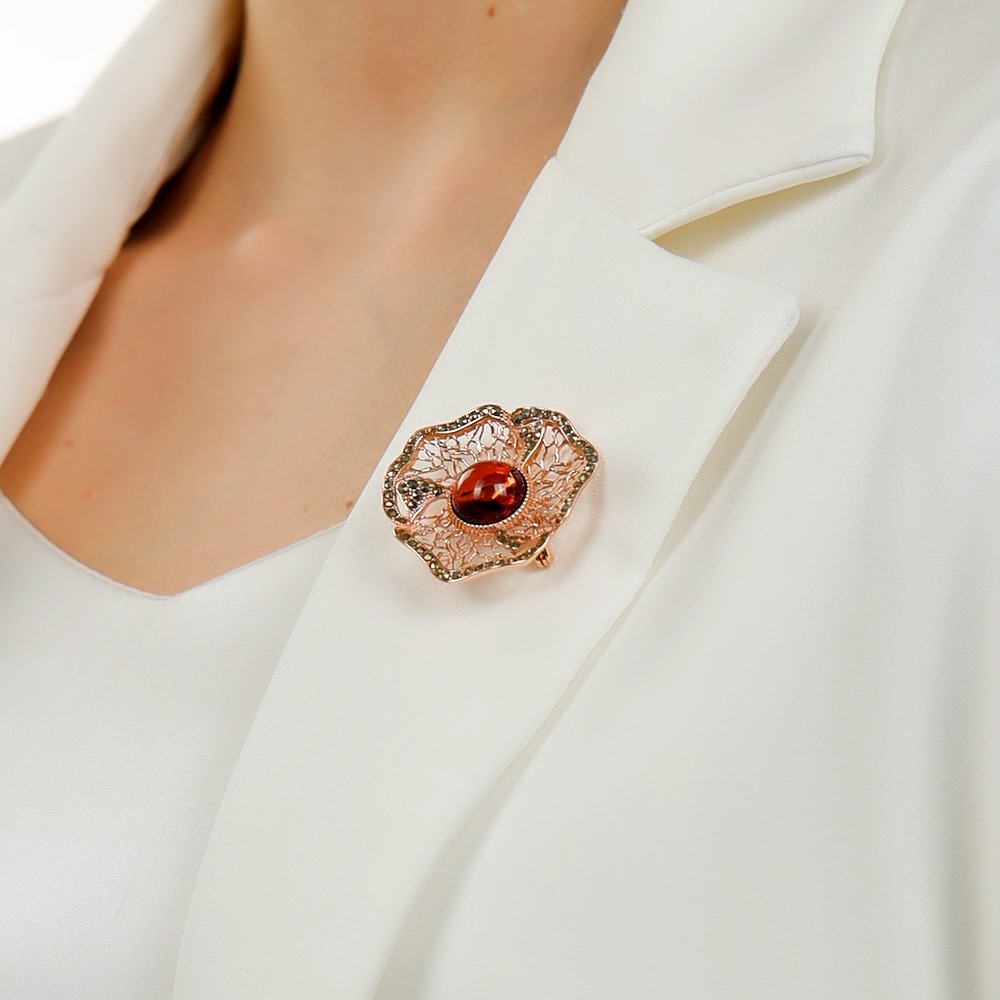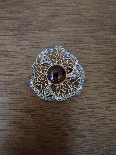 Серебряная брошь с янтарем и марказитами природными