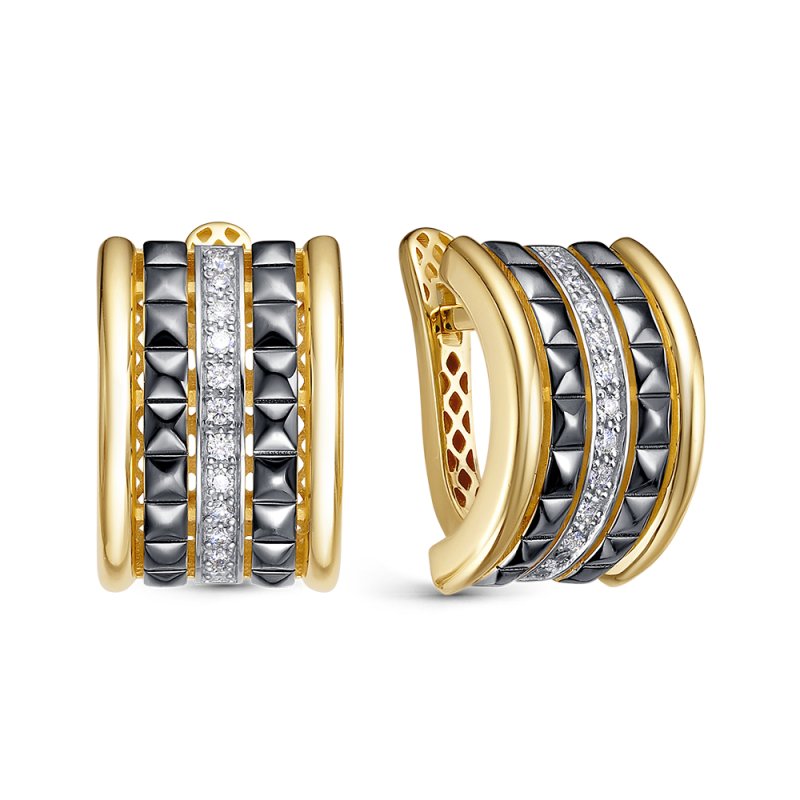 Серьги с 6 гранатами зелеными природными, 0.11 карат, тип огранки А; 10 гранатами зелеными природными, 0.09 карат, тип огранки А; 4 бриллиантами черными природными облагороженными, 0.02 карат, огранка круг 57 граней, цвет 7, чистота 6, тип огранки А; 24 гранатами зелеными природными, 0.14 карат, тип огранки А; 72 бриллиантами коричневыми природными, 0.3 карат, огранка круг 57 граней, цвет 6, чистота 5, тип огранки А; Желтое золото 585 пробы.