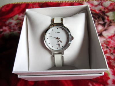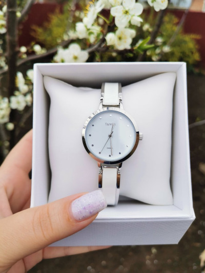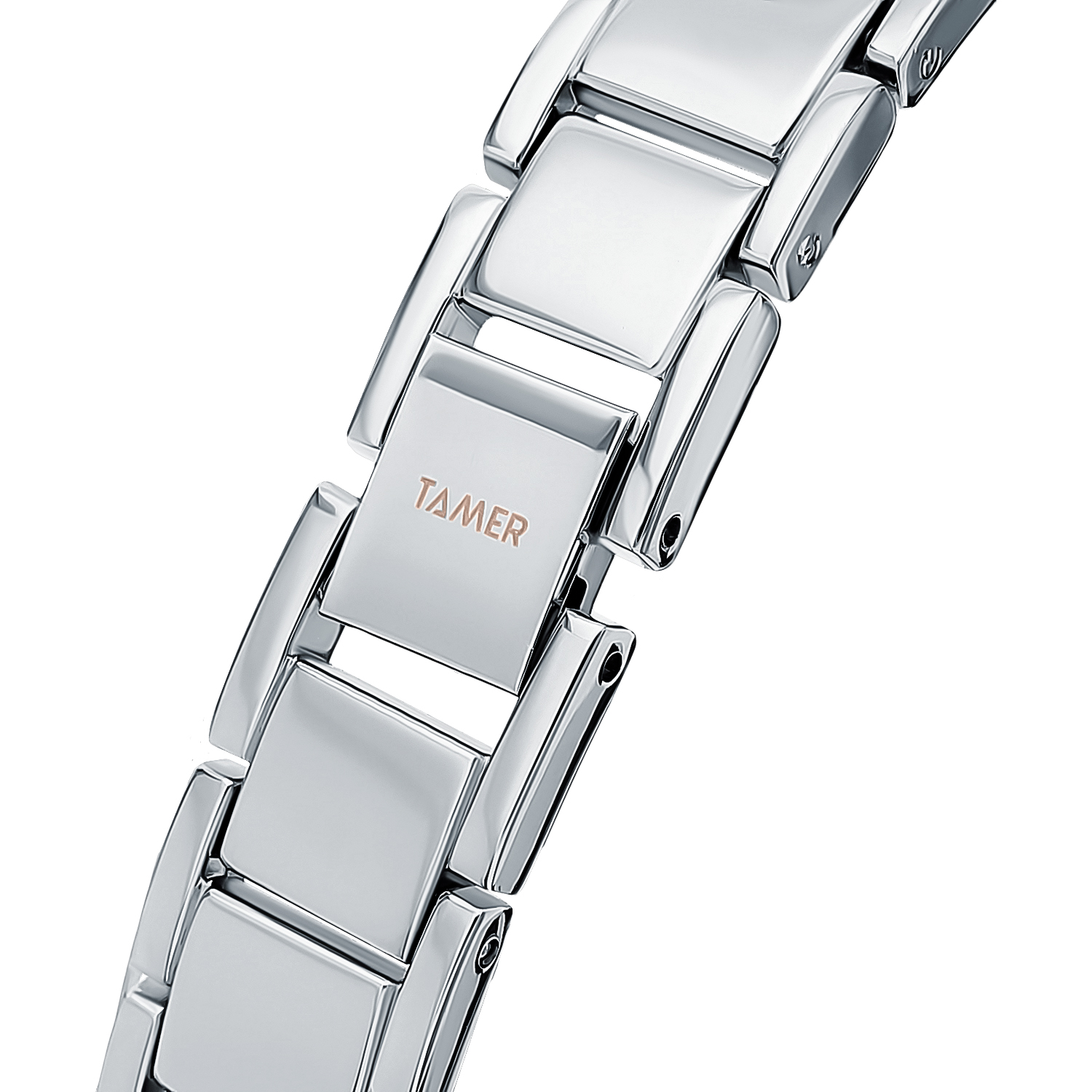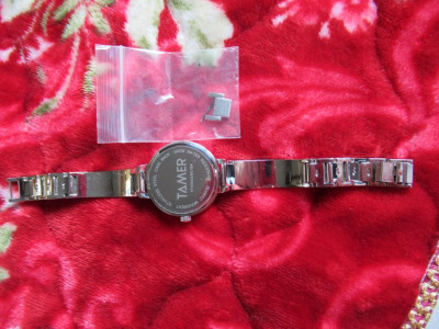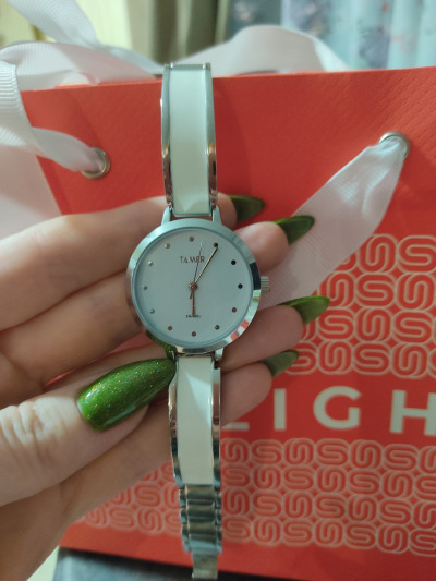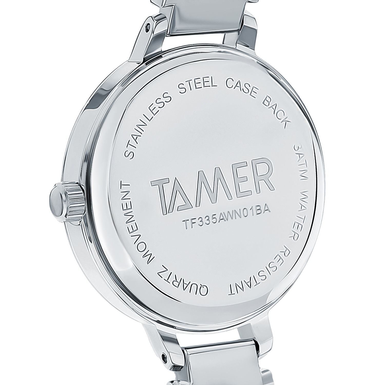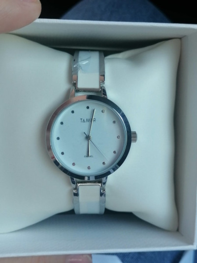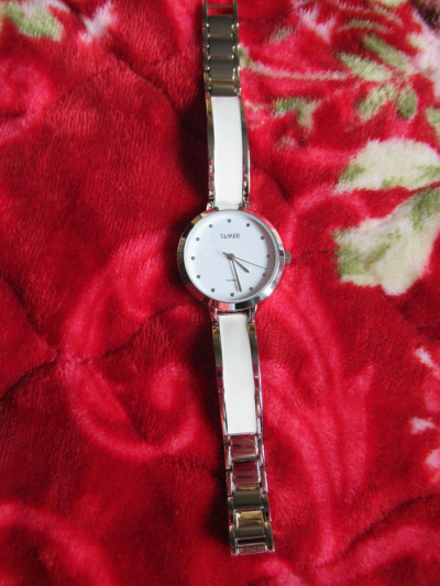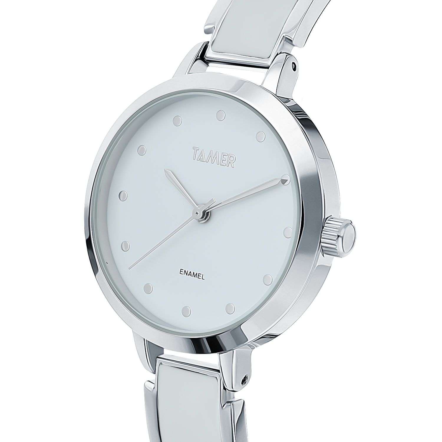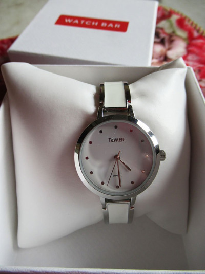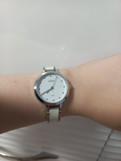 Стильные женские часы бренда TAMER с металлическим браслетом такого же стального цвета. Японский кварц. механизм. Цена умеренная. Дизайн классный. Циферблат белый и такое же оформление вставками на браслете. Циферблат оформлен со вкусом – ничего лишнего, но тоже стального цвета стрелка и деления на циферблате.