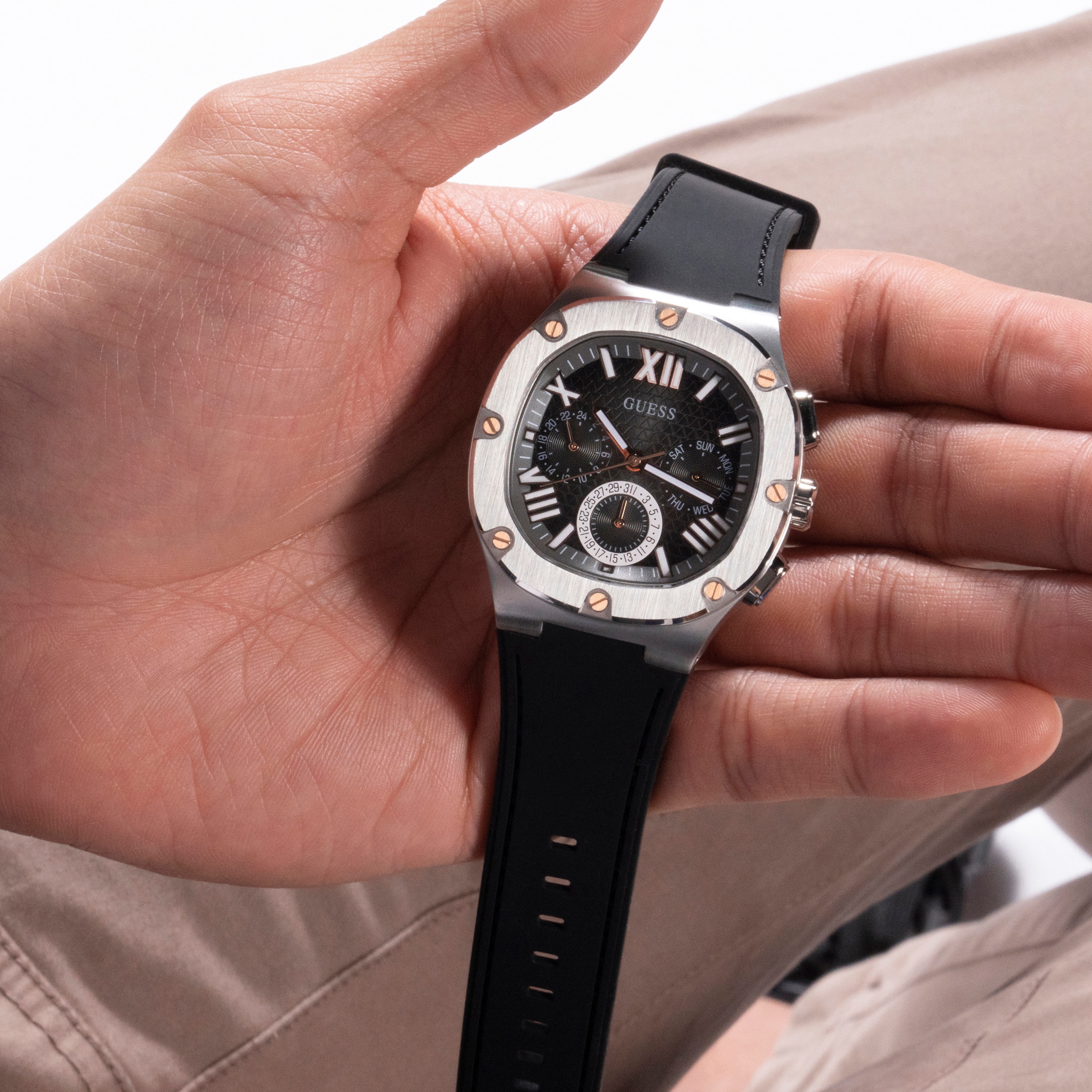 Мужские наручные часы GUESS модель GW0571G1 из коллекции GUESS DRESS. Японский кварцевый мультифункциональный механизм VX9JE1S SEIKO (TMI) с вынесенными на отдельные циферблаты датой, днем недели и часовой стрелкой в режиме 24 часа использующий элемент питания SR927SW. Стальной корпус размера 42 мм. Минеральное стекло. Силиконовый ремешок. Водостойкость 5 АТМ (мытье рук, дождь). GUESS – лидер в индустрии фешен часов по длительности присутствия на рынке и по ширине коллекции, ежегодно создает более 100 новинок. Компания GUESS Watches, основанная в 1984 году в Лос-Анджелесе (США) как пионер революции, возглавила трансформацию часов из простого инструмента для определения времени в стильный аксессуар. Бренд не боится экспериментировать. Разнообразные формы корпуса, сложно декорированные циферблаты, уникальный дизайн браслетов. GUESS – это про тренды и технологии в мире моды. Это яркие и дизайнерские часы, призванные угодить самым смелым фешн-драйверам и энтузиастам моды по всему миру. Страна-изготовитель: Филиппины. При изготовлении используются только надежные Японские механизмы. ВНИМАНИЕ! Заявленная водостойкость гарантируется только при плотно закрытой или закрученной заводной головке!