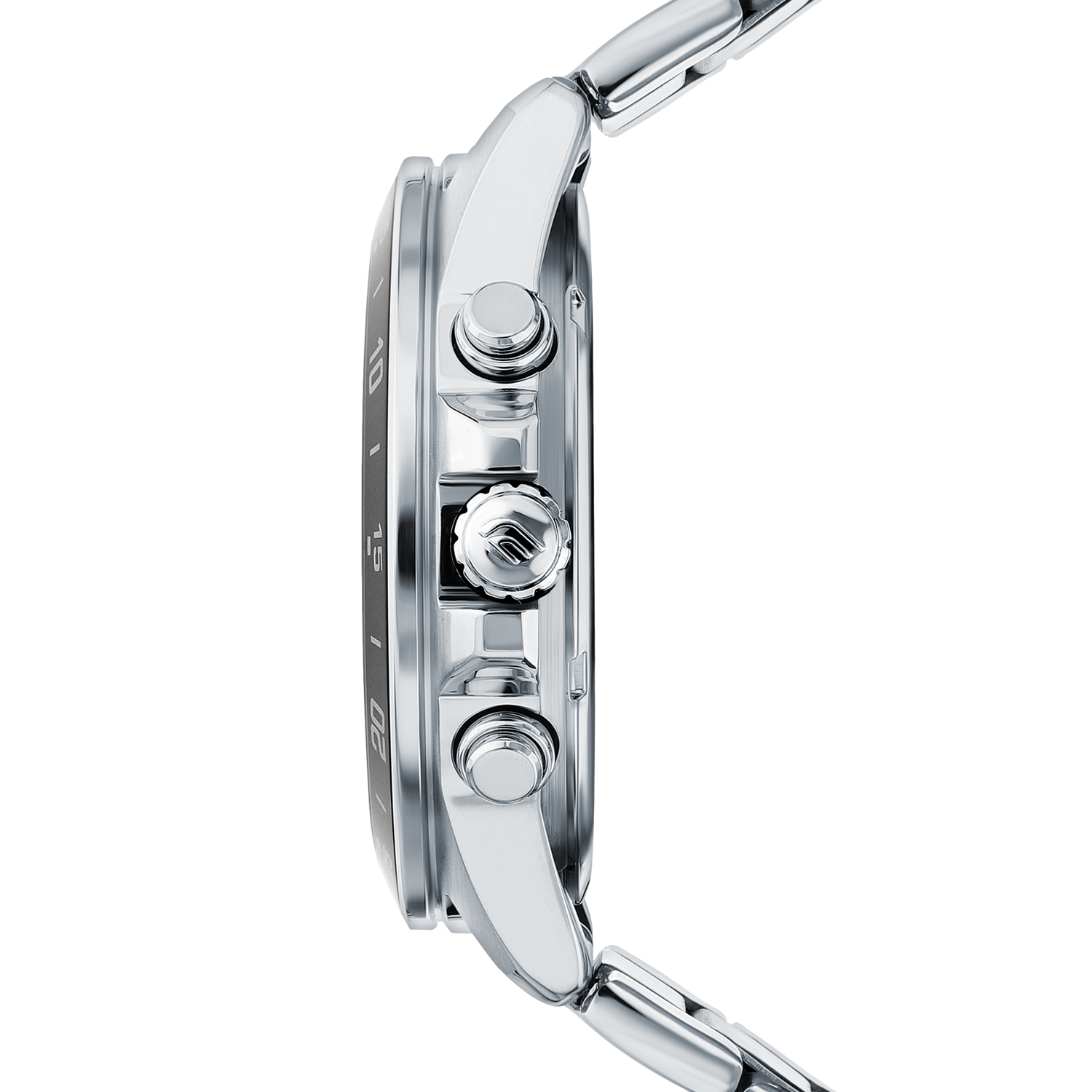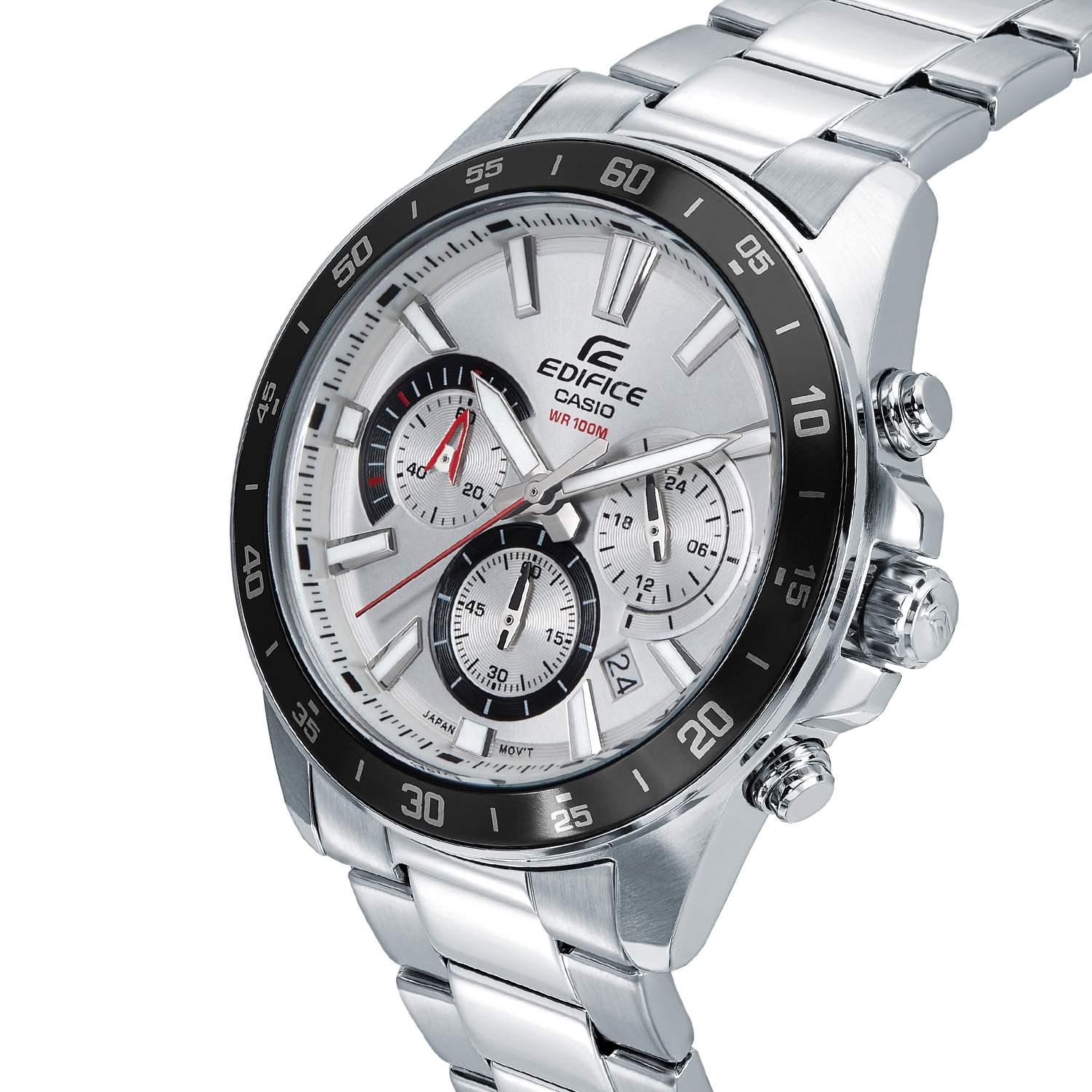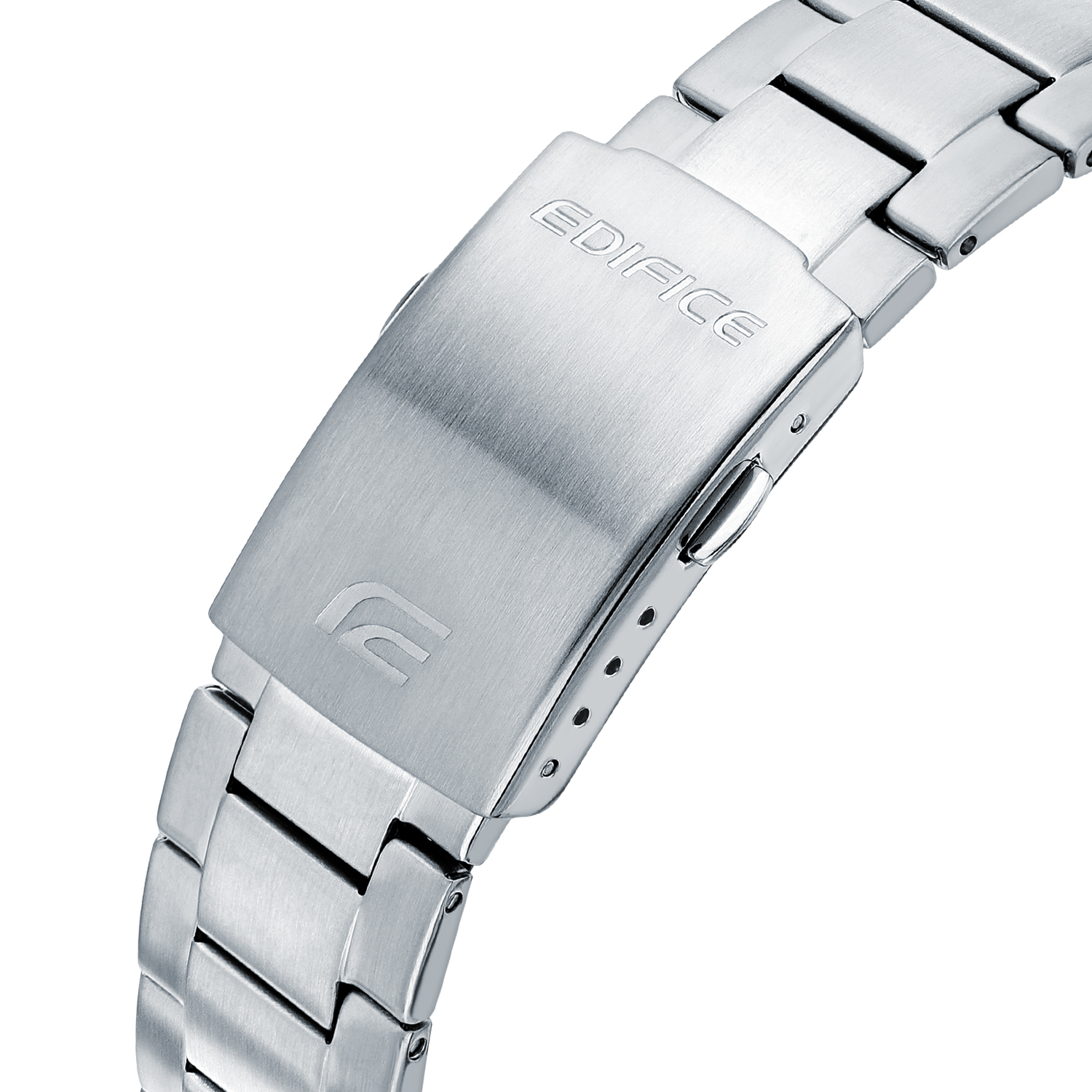 Крупный хронограф из серии Edifice в стальном корпусе с серебристым циферблатом и черным безелем. Модель отличает сбалансированный дизайн, внушительные размеры и спортивный автомобильный характер. Циферблат защищен прочным минеральным стеклом, а водозащита позволяет пользоваться часами в любых погодных условиях. Cекундомер, емкостью в один час и точностью измерения до одной секунды, отображает свои показатели с помощью индикации у отметки 6 и 9 часов по циферблату.