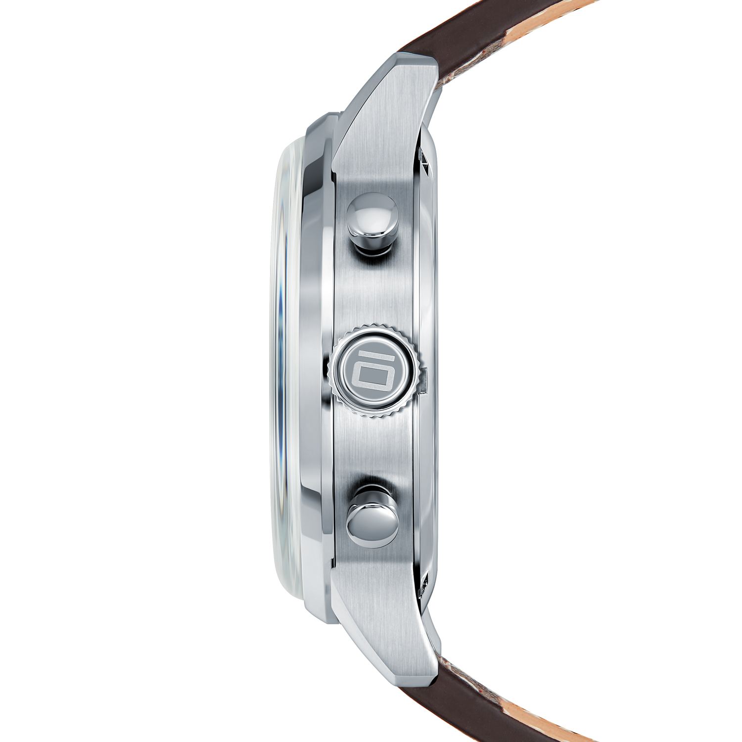 Корпус выполнен из стали, минеральное стекло с антибликом защищает циферблат от внешнего воздействия. Японский кварцевый механизм EPSON VR31 обеспечивает точный ход и оснащен функциями времени в 12/24 часовом формате, секундной стрелки, даты и хронографа. Водозащита 10 bar (100 m/330 ft)* позволяет плавать в часах.