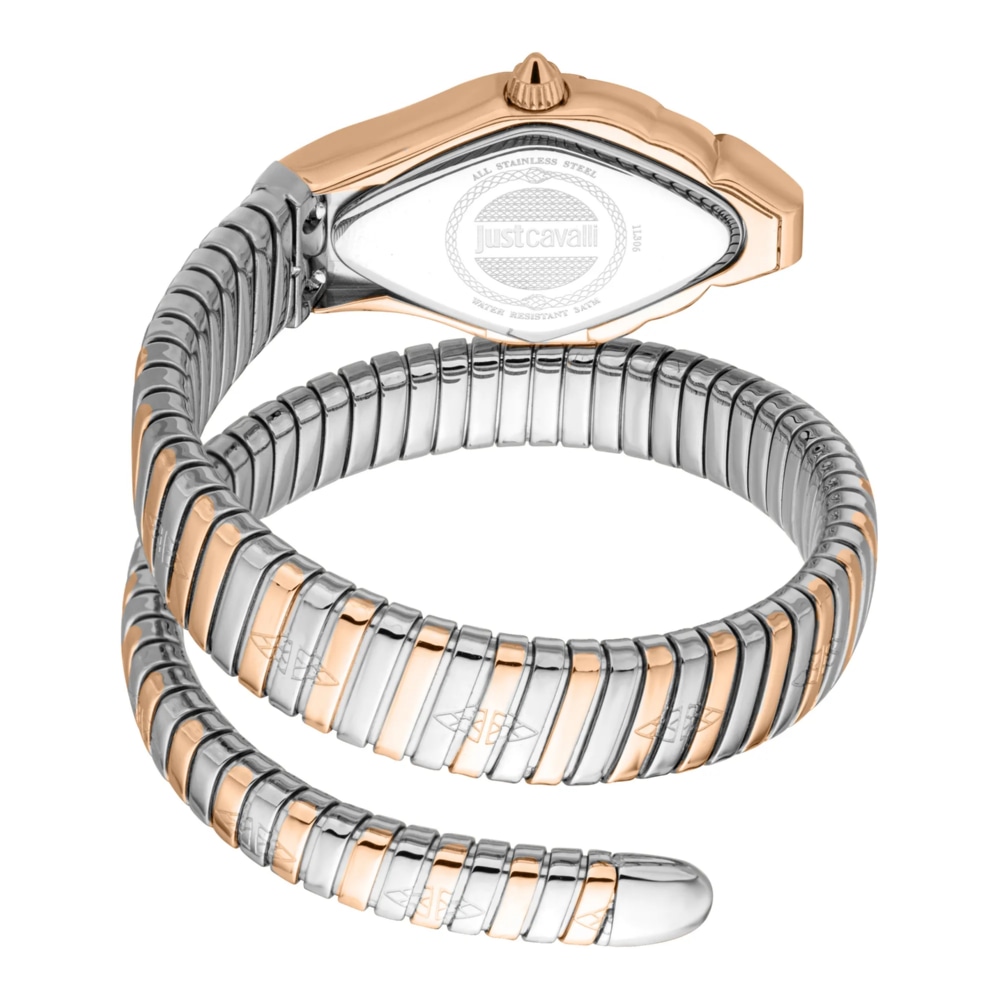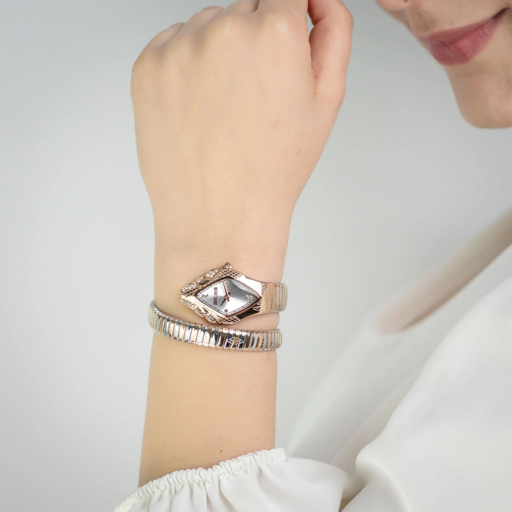 Женские наручные часы JUST CAVALLI SNAKE обвивающий запястье в форме змеи модель JC1L306M0075 из коллекции FEROCIOUS. Японский кварцевый механизм SEIKO. Стальной корпус размера 22 мм. Минеральное стекло. Стальной браслет. Водостойкость 3 АТМ (защита от брызг). Остерегайтесь попадания часов в воду. В мире высокой моды Roberto Cavalli знают как человека, который умеет превращать грубые обыденные материалы в неповторимый шик. Вся продукция бренда, будь то сумки, обувь или аксессуары, обладают высочайшим качеством и современным итальянским стилем. Сегодня группа компаний ROBERTO CAVALLI представлена на международных рынках своей основной линией - Roberto Cavalli и более молодежной, повседневной и трендовой - Just Cavalli. Часы марки Джаст Кавалли производятся на заводе в Китае. При изготовлении используются только надежные Японские механизмы. ВНИМАНИЕ! Заявленная водостойкость гарантируется только при плотно закрытой или закрученной заводной головке!