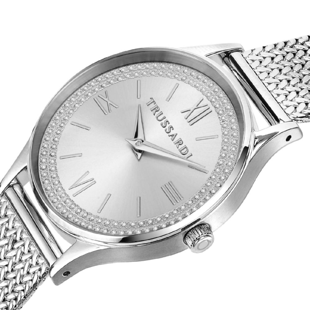 В элегантных и изысканных часы Trussardi R2453152509 из коллекции T-STAR все внимание к деталям. В модели установлен циферблат с узором «солнечные лучи», который украшают сияющие кристаллы. В часах установлен японский кварцевый механизм MIYOTA GL26. Прочное минеральное стекло. Диаметр корпуса – 34 мм. Водостойкость 5 АТМ (мытье рук, дождь). Рифленая заводная головка. Часы выполнены из нержавеющей стали 316L с частичным PVD-покрытием. Браслет миланского плетения с настраиваемой застежкой. Гарантия 2 года. Страна производства - Италия. В комплекте с часами: индивидуальная упаковка, паспорт, инструкция, гарантийный талон. Итальянский модный бренд с вековой историей и традициями. Компания была основана Данте Труссарди в 1911 году в Бергамо как небольшая фабрика по производству дорогих роскошных кожаных перчаток. За несколько лет его высококачественное сырье и постоянное совершенствование методов обработки кожи сделали Trussardi одной из самых известных фирм на международном рынке аксессуаров, а Данте Труссарди стал официальным поставщиком британской королевской семьи.