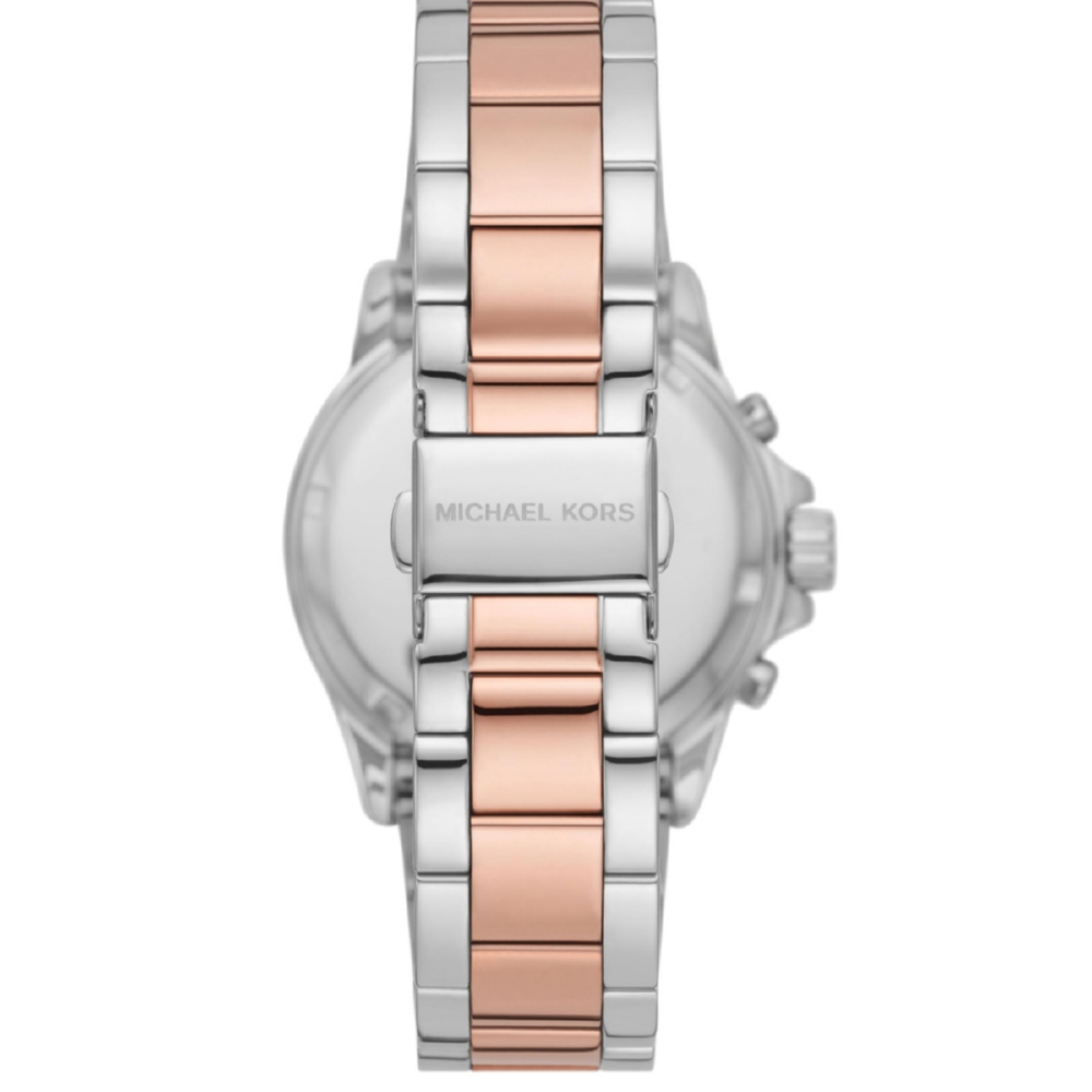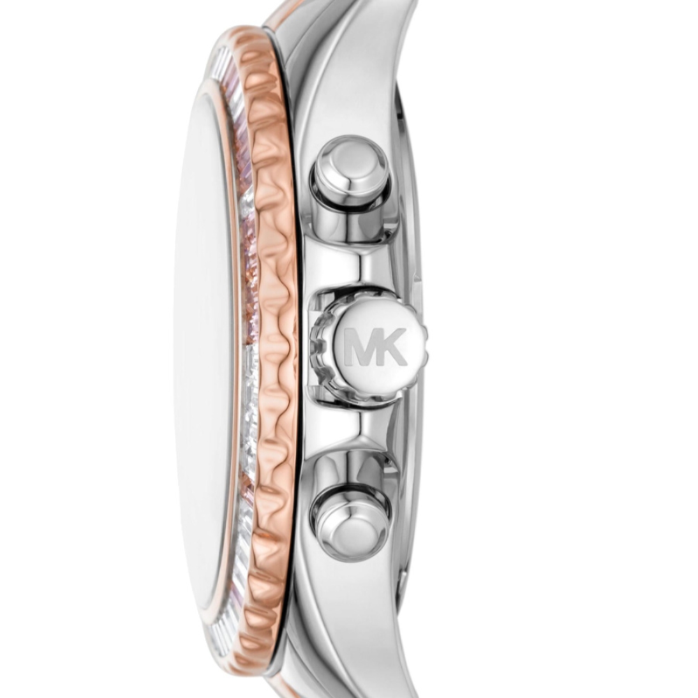 Наручные кварцевые женщинам часы марки MICHAEL KORS артикул MK7214. Стальной корпус размера 36 мм и толщиной 11 мм. Кроме стандартных в модели добавлена функция секундомера (хронограф) и часовая стрелка в режиме 24 часа. Минеральное стекло. Стальной браслет. Водостойкость 5 АТМ (мытье рук, дождь). Бренд Michael Kors, основанный в 1981 году, начал свою деятельность с создания линеек одежды разных стилей, но со временем в ассортименте появились аксессуары, ставшие настоящим прорывом в мире моды. Michael Kors – это один из самых узнаваемых и популярных американских брендов во всем мире. ВНИМАНИЕ! Заявленная водостойкость гарантируется только при плотно закрытой или закрученной заводной головке!