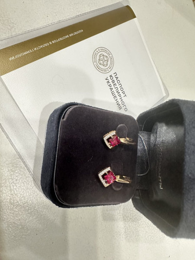 Золотые серьги с бриллиантами природными и рубинами выращенными