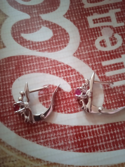 Очень симпатичные небольшие сережки с натуральными рубинами, необычная форма - сбоку блестят маленькие фианитики, отличная посадка на ушках.Супер!!