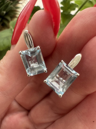 Серьги на каждый день. Легко застегиваются,негромоздкие и немаленькие. Привлек прямоугольный природный камень. Цвет топаза неяркий,то что надо,благородного нежно-голубого цвета