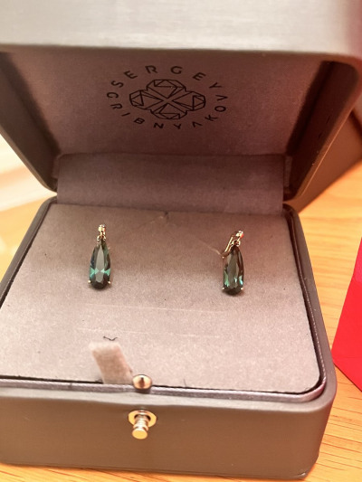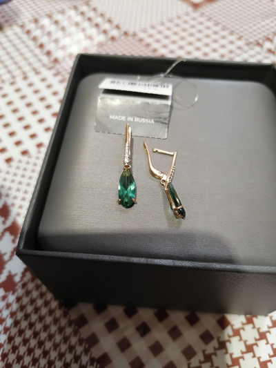 Красивые серьги из золота 585, с зеленым фианитом. Камень необычной огранки, в виде крупной капли. И маленькие бесцветные фианитики. Посадка удобная, закрывает прокол.Я молодец, что увидела их на сайте в каталоге и купила.