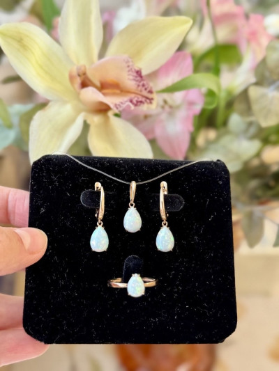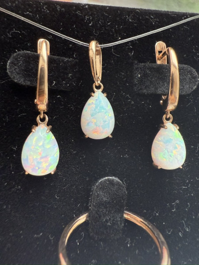 Опаловый комплект на каждый день для повседневного ношения. Подарил супруг на опаловую годовщину свадьбы. Комплект простой, но яркий за счет камней. Камни подсвечиваются разными цветами и поэтому очень универсальный в ношении. Синтетические опалы не такие капризные как натуральные, я спокойно делаю домашние дела и косметические процедуры. Подобрала очень похожее кольцо для полного комплекта. Комплект обращает на себя внимание!