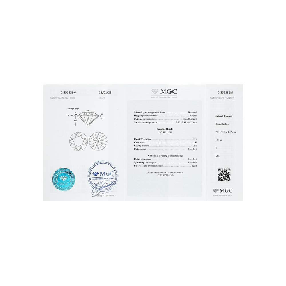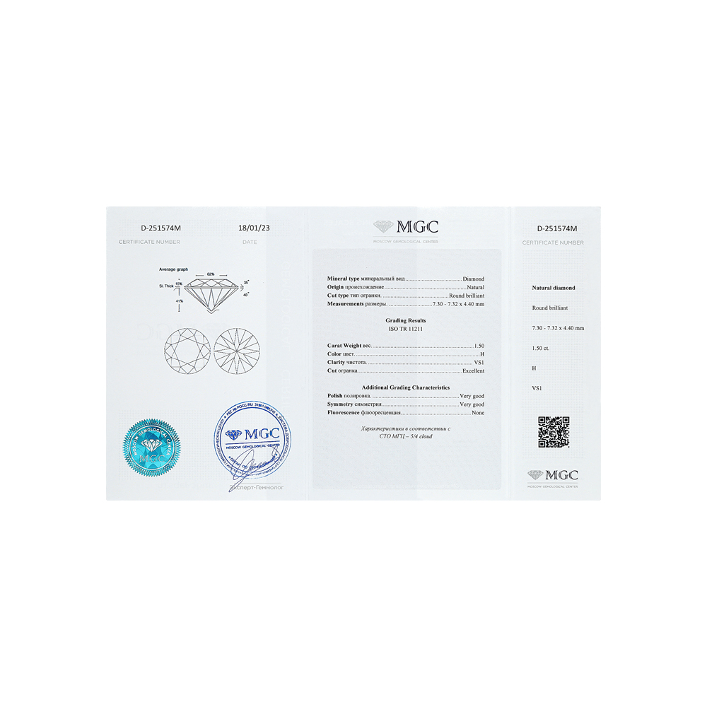 1 бриллиантом природным, 1.5 карат, огранка круг 57 граней, цвет 5, чистота 4, тип огранки А;