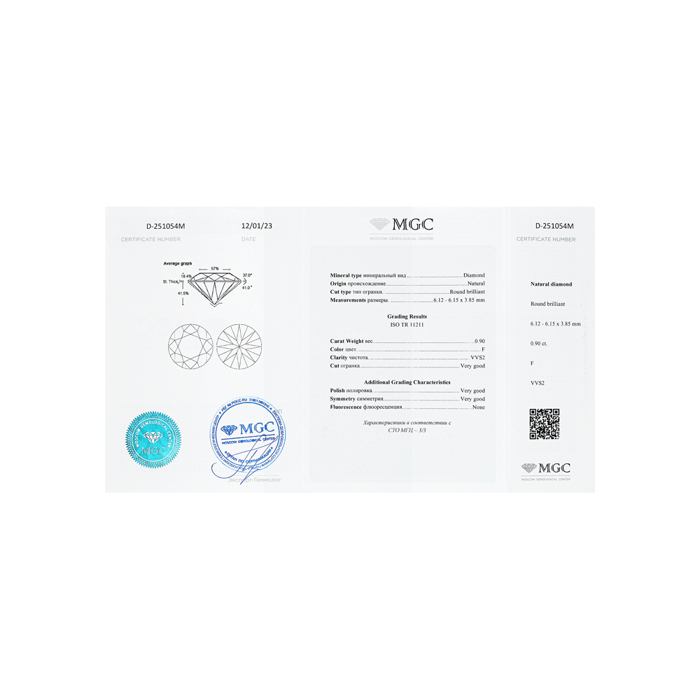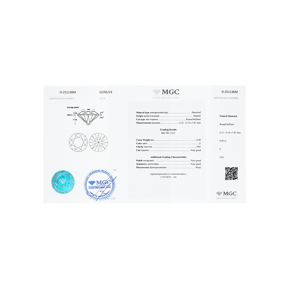 1 бриллиантом природным, 0.9 карат, огранка круг 57 граней, цвет 3, чистота 3, тип огранки А;