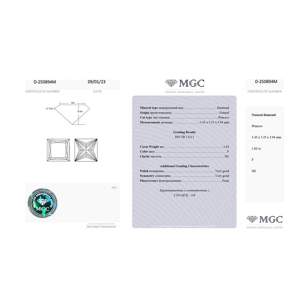 1 бриллиантом природным, 1.01 карат, огранка принцесса 65 граней, цвет 3, чистота 3, тип огранки А;