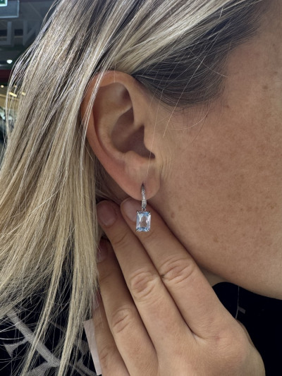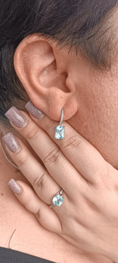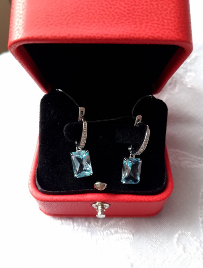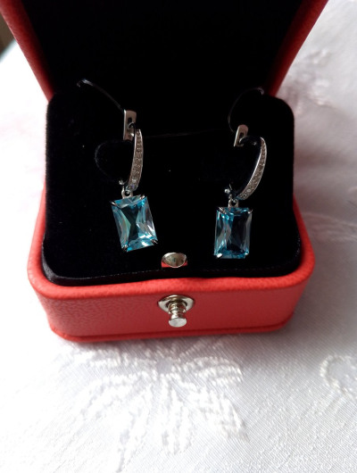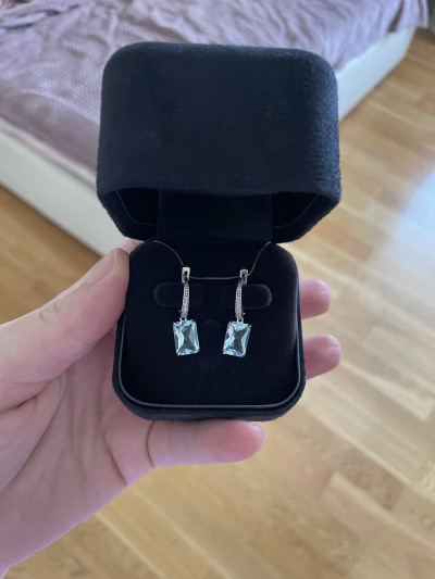 Изящные невесомые серьги, напоминают льдинки - оправы топаза практически не видно. При этом смотрятся очень современно за счет прямоугольной формы камня. Выбирала между ними и похожими в другом магазине, здесь привлекла именно оправа, которую почти не видно (громоздкая фурнитура на другом изделии сильно портила вид и утяжеляла украшение).