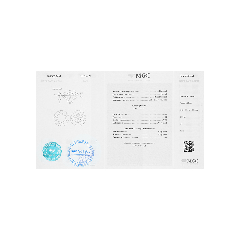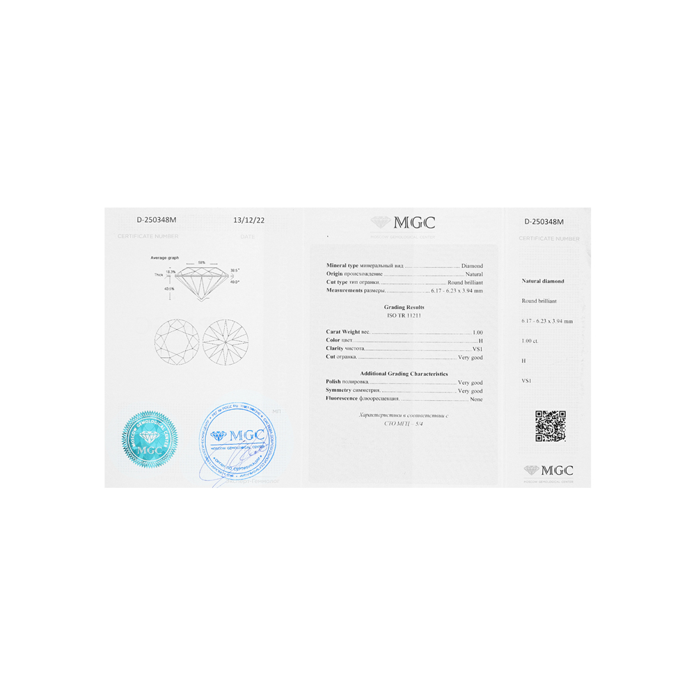 1 бриллиантом природным, 1 карат, огранка круг 57 граней, цвет 5, чистота 5, тип огранки А;