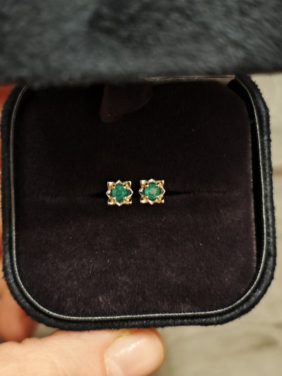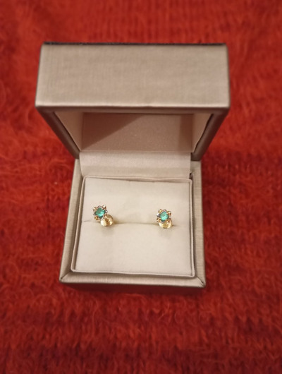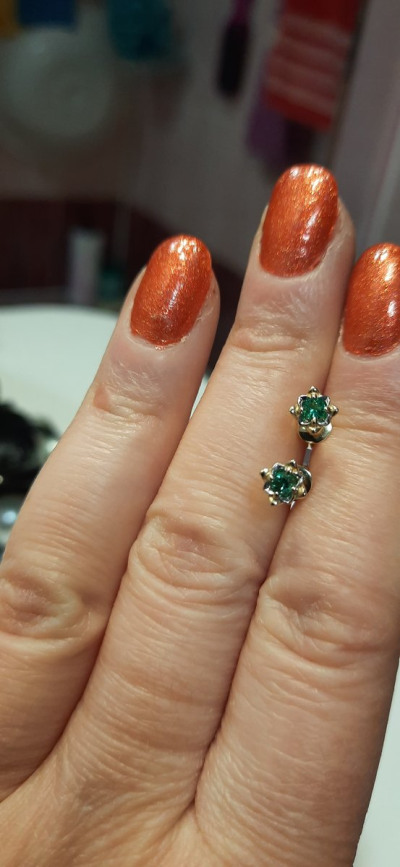 Очень нежные ,красивые ,заметные серьги,хоть и небольшие.Камень насыщенного зелёного цвета . У другой пары были светлее камни,но прозрачнее. Надо заказывать несколько пар ,чтобы была возможность выбора камня.Подарком очень довольна.