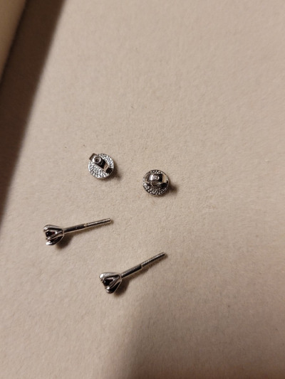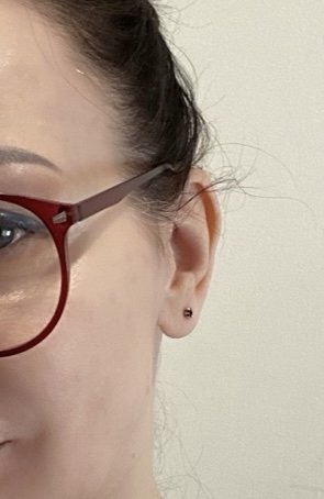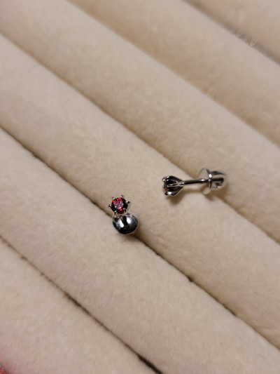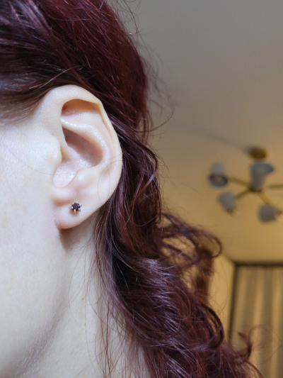 Пусеты понравились, минималистичные и изящные, очень хорошо подошли мне под цвет волос. В зависимости от освещения они переливаются либо темно бордовым, либо красным цветом. У меня маленькие уши, поэтому на мне они не выглядят мелкими, винты длинные, на любую мочку подойдут.