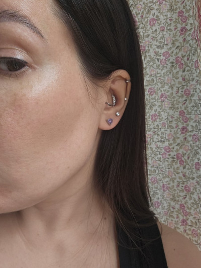 Хорошие лаконичные гвоздики. Брала дочке ( белокожая, голубоглазая) - ей очень идёт 👍🏼. Застёжка на винтах. На тонкую мочку хорошо по штифту сели.