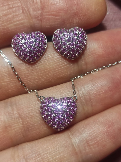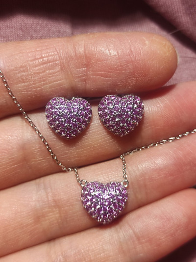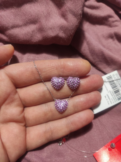 Взяла сразу комплектом к серьгам, в реальности цвет камней не такой яркий, как на фото, более нежный, не совсем как привычный оттенок корунда, но мне все равно понравилось, искрится будто, взяла для разнообразия в коллекцию. Цепочка с удлинением до 45 см, очень удобно.