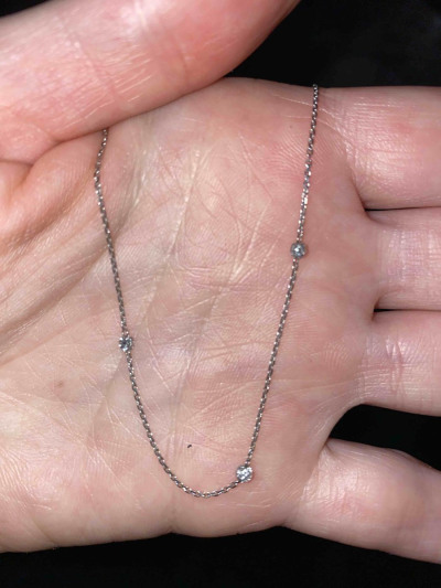 Нежное колье с 3 брильянтиками, подчеркнет красоту вашей шеи смотрится нежно. Равнодушных нет, я получила миллион комплементов идеально как на каждый день, так в пир. Несмотря что тоненькое плетение очень прочное, нравится что регулируется длинна изделия за счет кружочка- замка можно подтянуть по шее или ослабить ( я про это узнала соучайно прсле 2 месяцев носки ) .