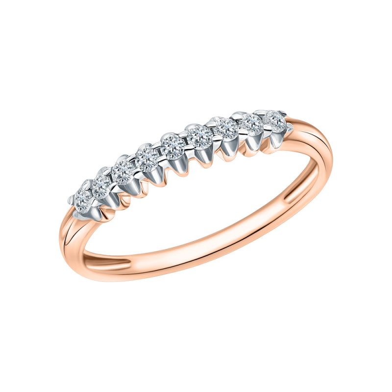 Кольцо с 3 бриллиантами природными, 0.03 карат, огранка круг 57 граней, цвет 3, чистота 6, тип огранки А; 5 бриллиантами природными, 0.03 карат, огранка круг 57 граней, цвет 3, чистота 6, тип огранки А; 5 бриллиантами природными, 0.02 карат, огранка круг 17 граней, цвет 2, чистота 2, тип огранки Б; Розовое золото 585 пробы.