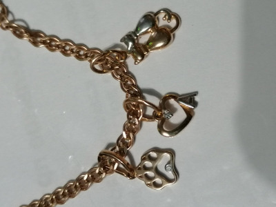 Очень оригинальная подвеска из розового золота с бриллиантом. Она достойно смотрится на браслете и всегда поднимает настроение