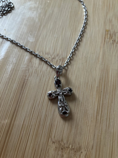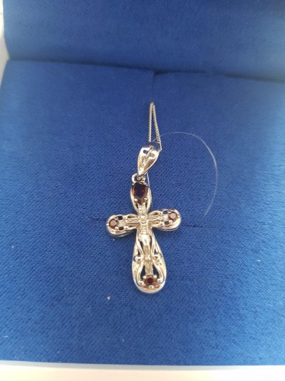 Крестик размер 3см на 2см с 4 натуральным гранатами,Ag925,хорошо что без позолоты, всё что в позолоте,если носится постоянно или часто,через год всё облезает,а если не использовать часто позолота темнеет и смотрится простой медяшкой грязно и неряшливо,а если со временем серебро потемнеет, его можно до блеска начистить и опять как новое, особенно отвратительно смотрятся цепи, по этому больше позолоченные украшения не покупаю ,деньги на ветер,как говориться!