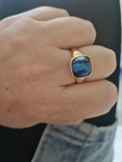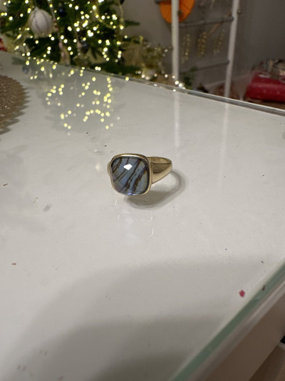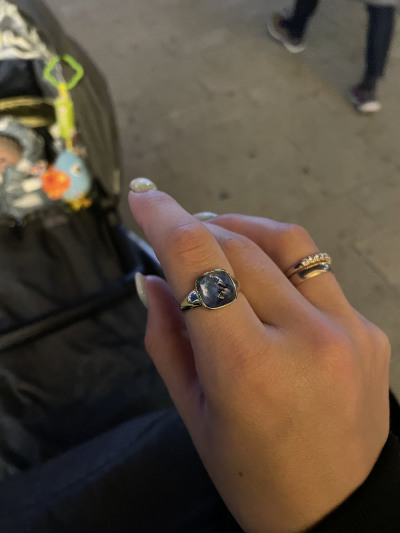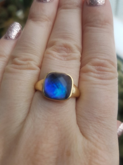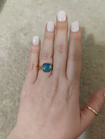 Небольшой перстень, но заметный. Меняет оттенки синего от освещения