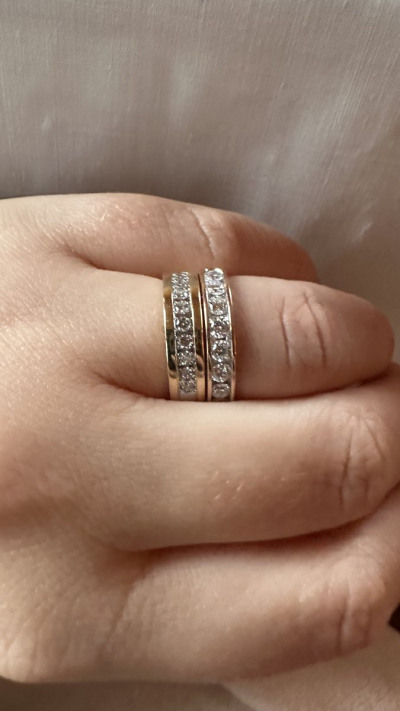 Купила только из-за акции «50% от стоимости при покупке второго». Карат по факту меньше, чем заявлено, золота больше (более 5 гр.). Купила и поняла, что оно мне все таки не нравится и размер оказался меньше, чем у второго кольца, которое покупала в паре (размер у двух колец одинаковый заявлен, но данное все-таки теснее). Очень пожалела, что не взяла такую же дорожку 330707 только в белом цвете по акции (((. Разница между ними огромная, 330707 (в это просто влюбилась с первого взгляда).