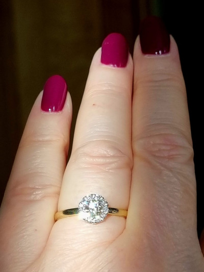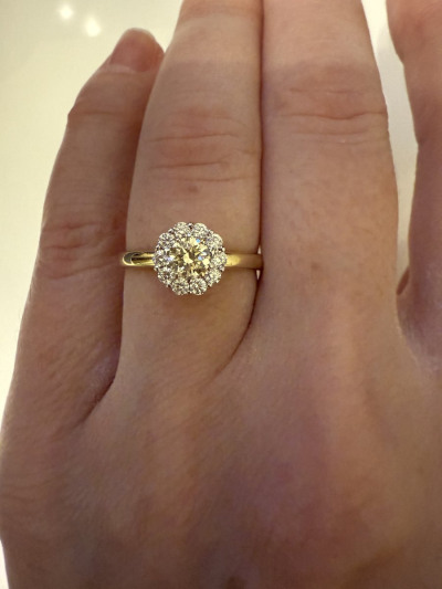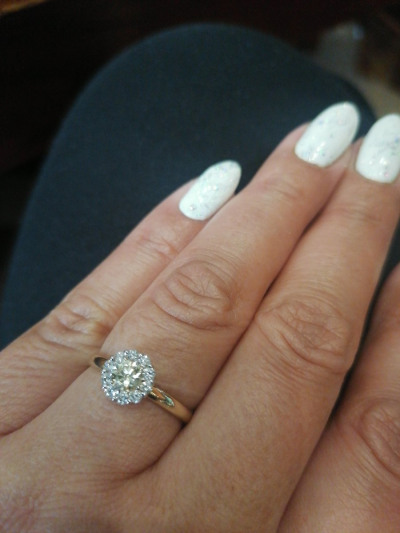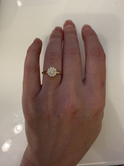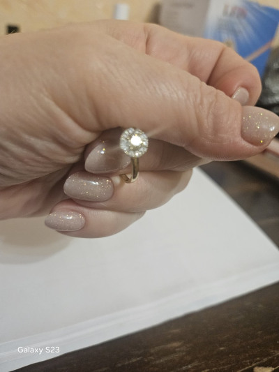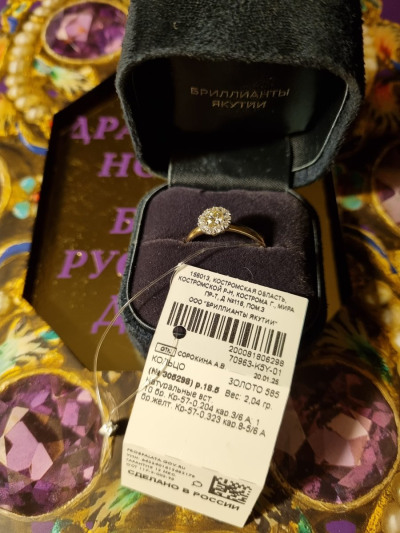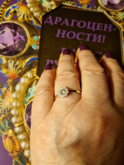 Сомневалась, брать или нет, т.к. центральный желтый бриллиант не такой яркий, как на картинке - цвет больше похож на шампань. К тому же колечко маломерит и сделала второй заказ на пол размера больше. Но всё же купила, т.к. дизайн учень удачный и все бриллианты издалека сливаются и эффектно сверкают. Цвет бриллианта отлично смотрится с желтым золотом. Колечко не крупное, но, как говорится, мал да удал. Довольна покупкой!
