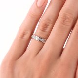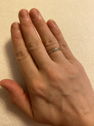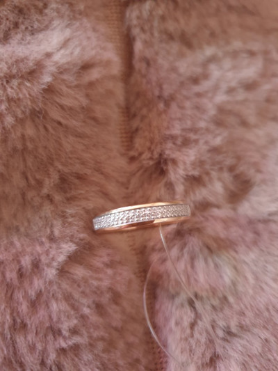 Красивое кольцо, не тонкое, цельное. Нижняя часть без камней, широкая, верхняя с дорожкой визуально кажется тоньше. Блестит красиво.