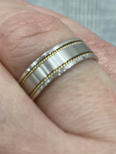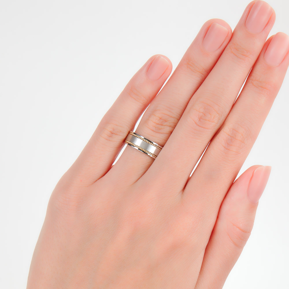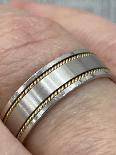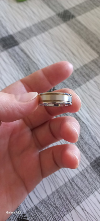 Хорошего качество кольцо, вес меньше заявленного, но мне пересчитали разницу при отправке и вышло дешевле первоначальной цены. Внутри «косичка» из желтого золота. Достаточно широкое, 6 мм, рекомендую брать на 0,5 размера больше своего, чтобы не передавливало палец.