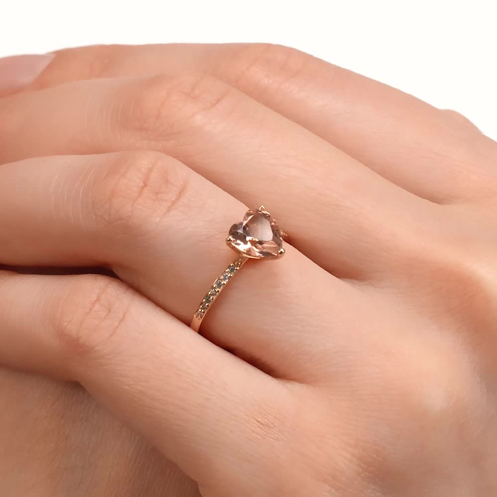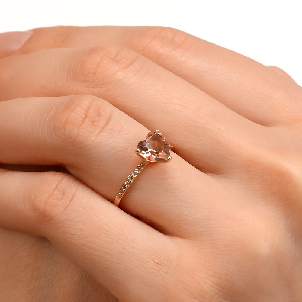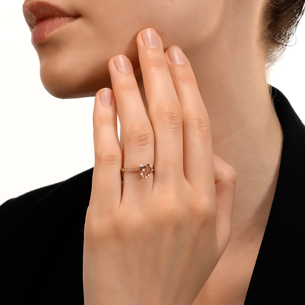 Изготовлено из розового золота 585 пробы и украшено блестящим фианитом. Главной изюминкой является крупный наноситал морганит весом 1.435 карат. Его огранка типа Б придает камню великолепный блеск и игру света.