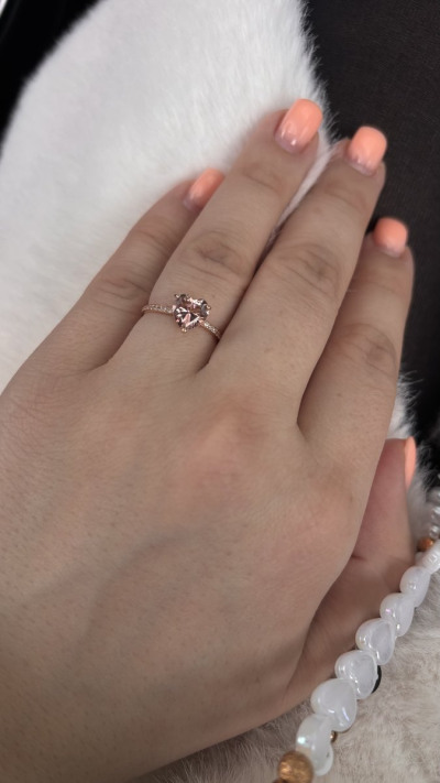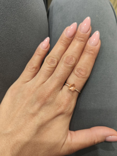 Милое тонкое колечко, я влюбилась в цвет камня, очень необычный, будто персиковый. Отлично смотрится в паре с обручалкой ❤️