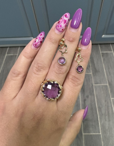 Красивое кольцо, хотела аметист именно в желтом золоте, серьги подобрала в сторонней компании, в санлайте не было ничего подходящего. Маломерит на пол размера