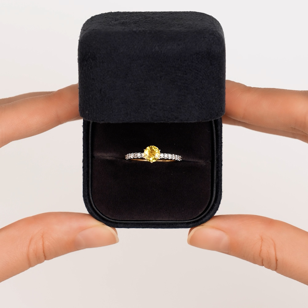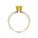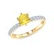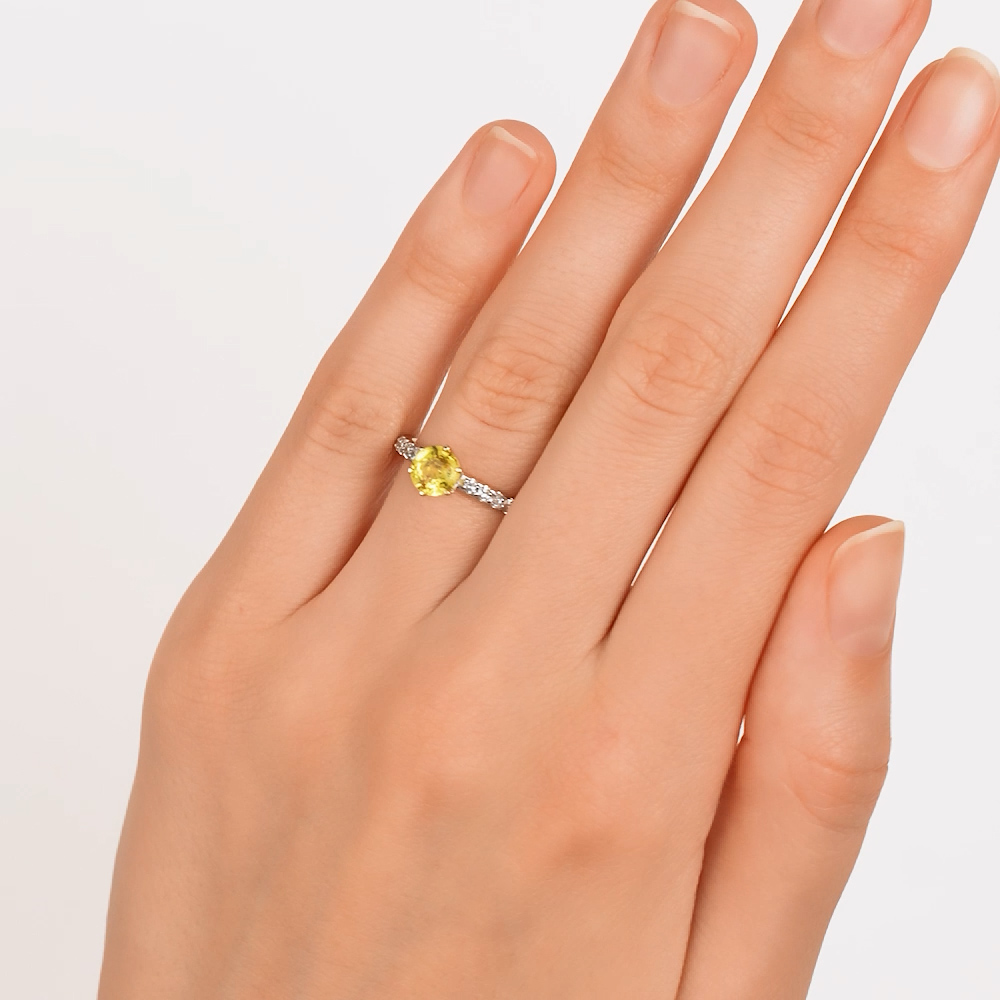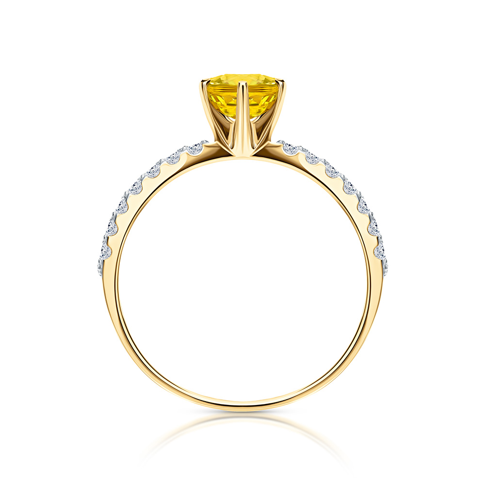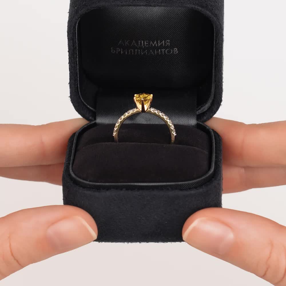 Кольцо выполнено из жёлтого золота 585 пробы, что усиливает яркость цвета вставки из жёлтого сапфира. По шинке украшено бриллиантами. Шинка толстенькая. На пальце заметно.