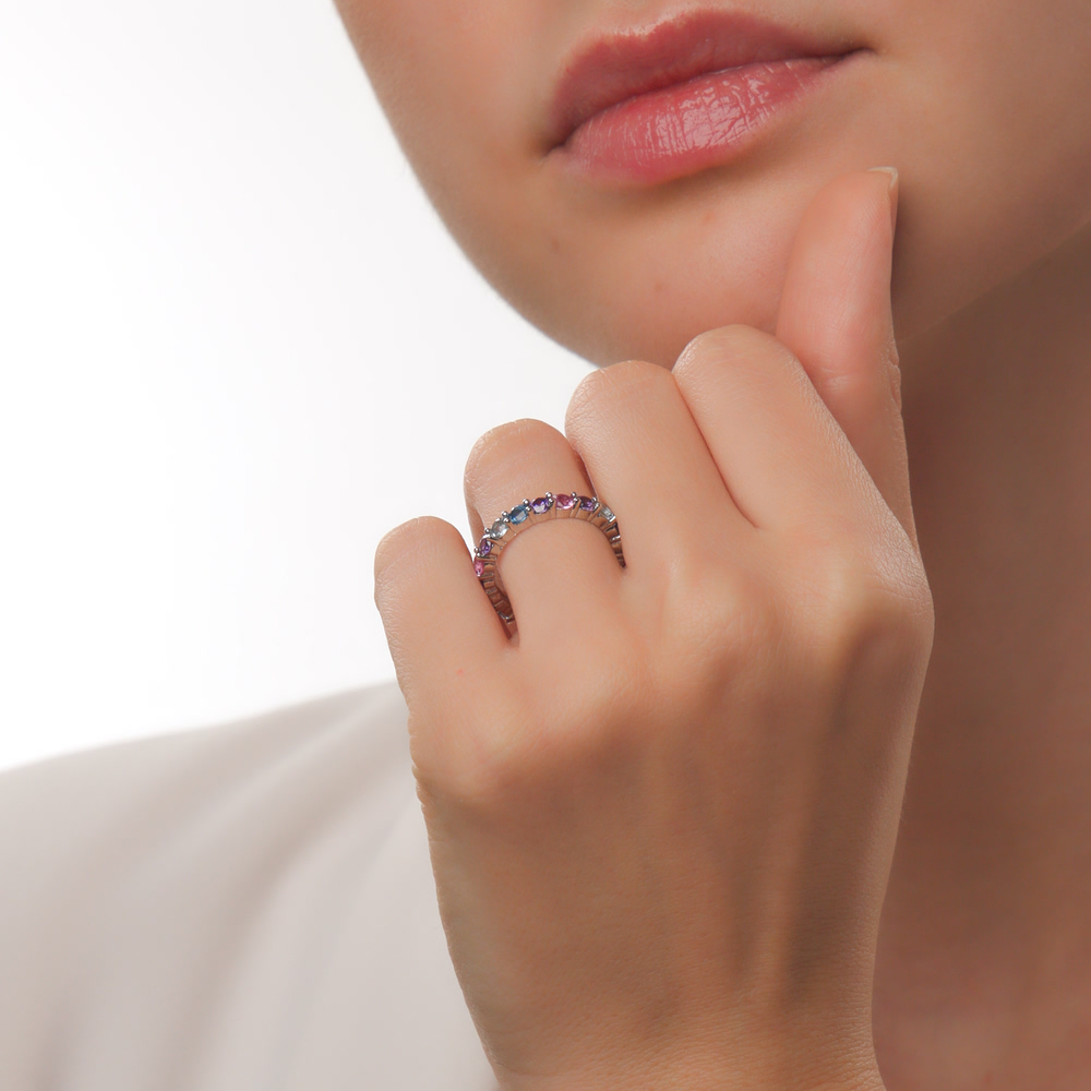Серебряное кольцо с фианитами, синтетическим корундом и синтетической шпинелью