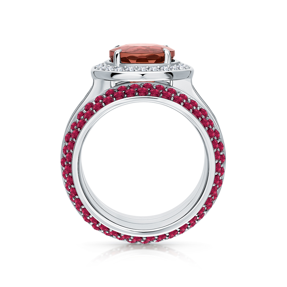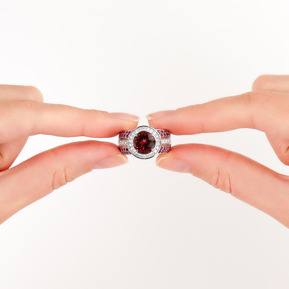 Это кольцо с крупным розовым турмалином, бриллиантами и множеством маленьких розовых турмалинов из Бразилии олицетворяет историю любви и гармонию природы.