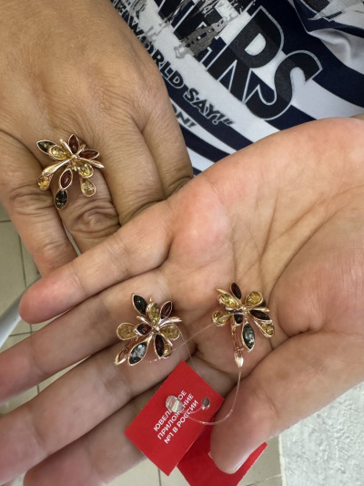 Серебро 925 проба с позолотой, серьги подбирали под кольцо, была еще брошка ( мы не взяли так как не носим), для женщин с формами этот комплект