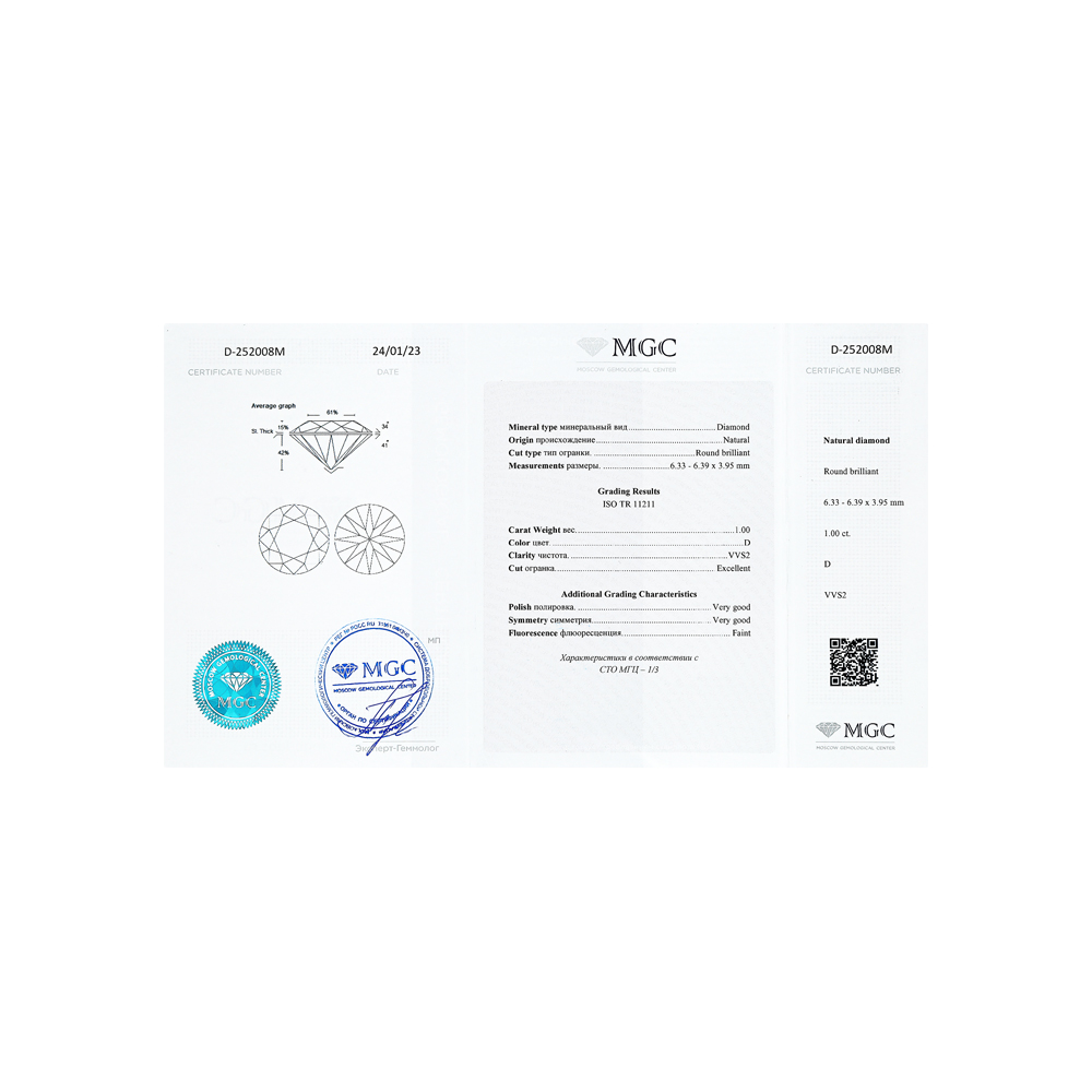 Кольцо с 1 бриллиантом природным, 1 карат, огранка круг 57 граней, цвет 1, чистота 3, тип огранки А;
