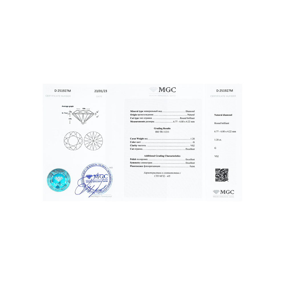 Кольцо с 1 бриллиантом природным, 1.2 карат, огранка круг 57 граней, цвет 4, чистота 5, тип огранки А;