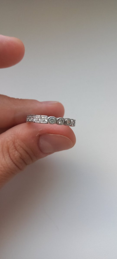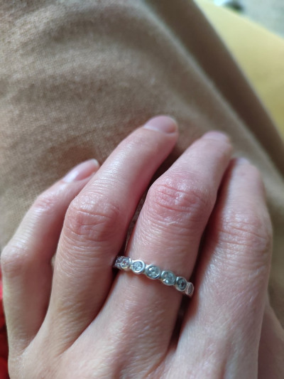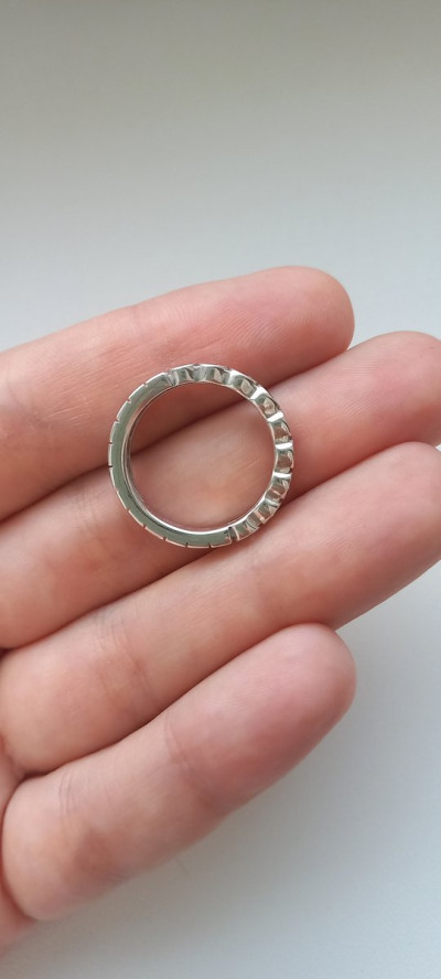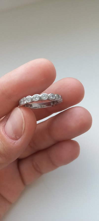 Фианиты по всей шинке кольца, половина круглые вставки, а половина - квадратные. Можно носить либо одной, либо другой стороной. Необычно.