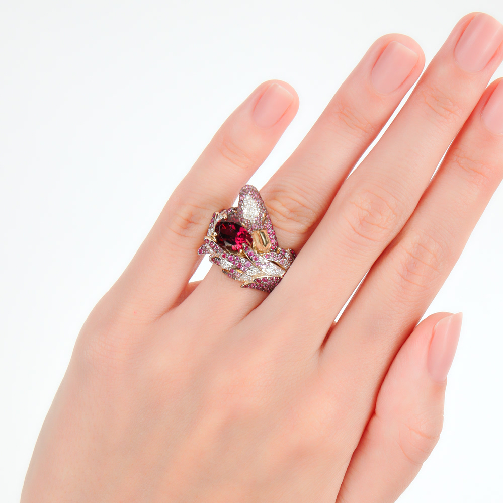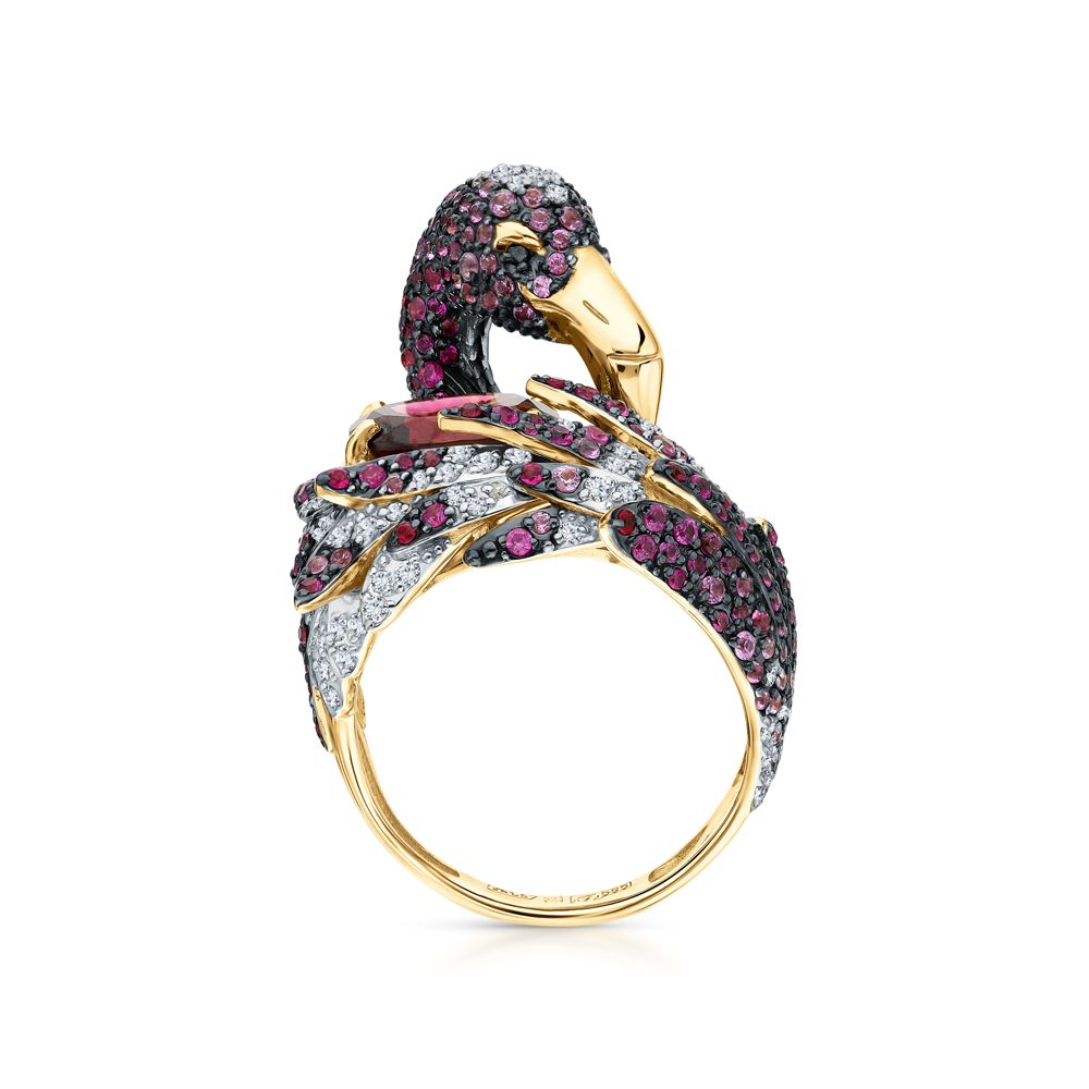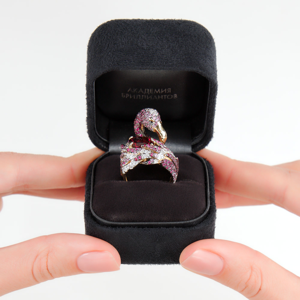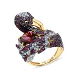 Золотое кольцо с бриллиантами и бриллиантами чёрными природными, сапфирами природными, рубинами природными и родолит природными