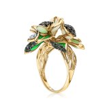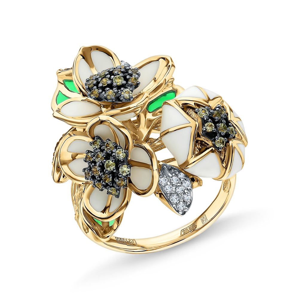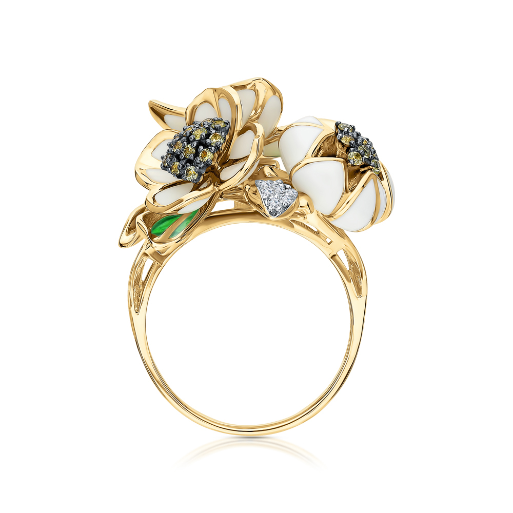 Золотое кольцо с бриллиантами природными, эмалью и сапфирами природными