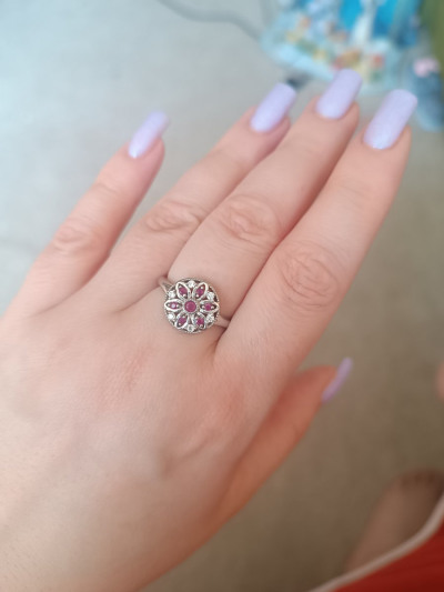 Необычное кольцо с вкраплениями из рубинов. Смотрится эффектно. На фото казалось больше. Но в целом, я довольна приобретением.