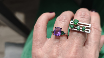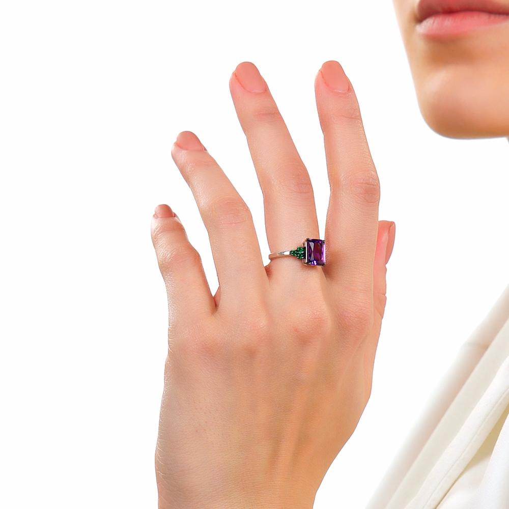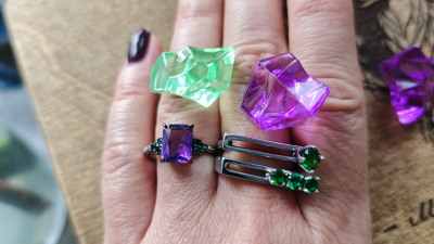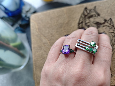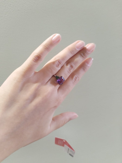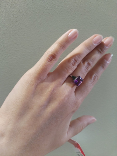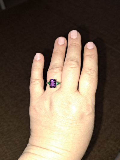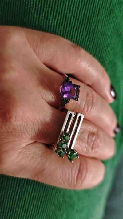 Очень яркое кольцо. Аметист большой, прямоугольный, благодаря граням, красиво переливается на солнышке. Фианиты насыщенно зеленого цвета (бутылочного). В носке удобное, не цепляется, камни хорошо закреплены. Мне понравилось, для любителей тихой роскоши слишком цветное, но для тех кто хочет привлечь внимание, самое то)